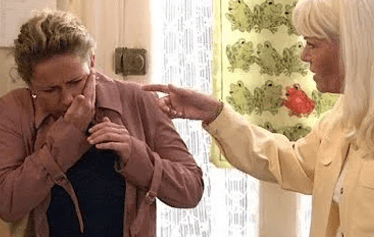 By the time Little Mo had returned to the Fowler kitchen with her sisters after clobbering ex-husband Trevor with Pauline’s iron (her frying pan, her iron, what next? Her door stop?) and the Slater girls were stunned to find him gone. They scrubbed up the evidence and went home, hoping Trevor had learnt his lesson now and wouldn’t be back.