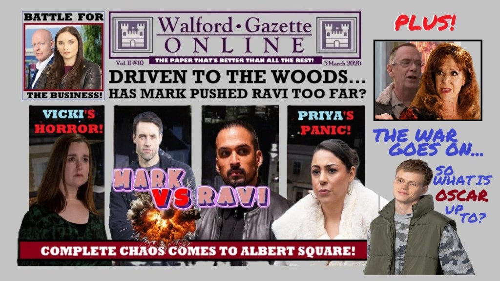 Of course, he doesn’t live in a romantic-comedy, he’s in a soap opera, and in soap the only way to go is down! This week, Priya notices more about Ravi’s behaviour when he gets involved in a big mess with Mark Fowler and the head of their criminal gang.